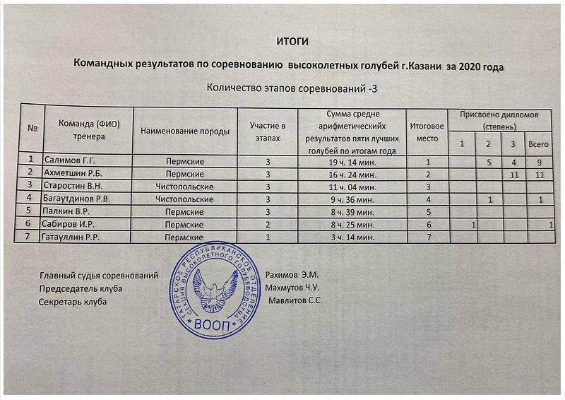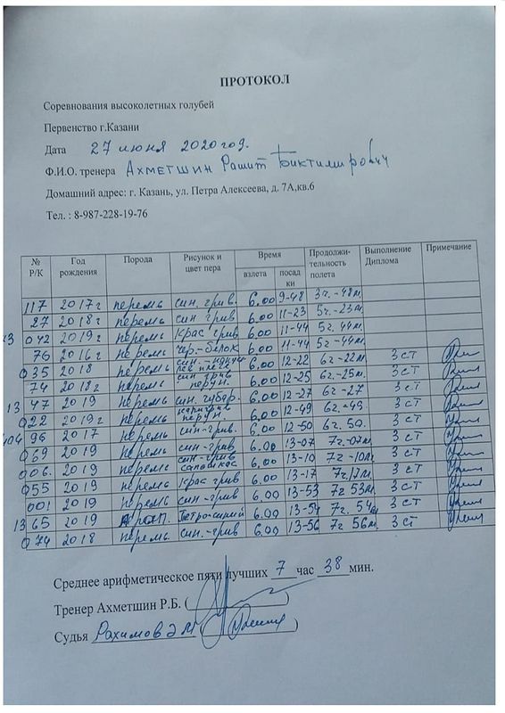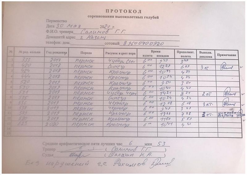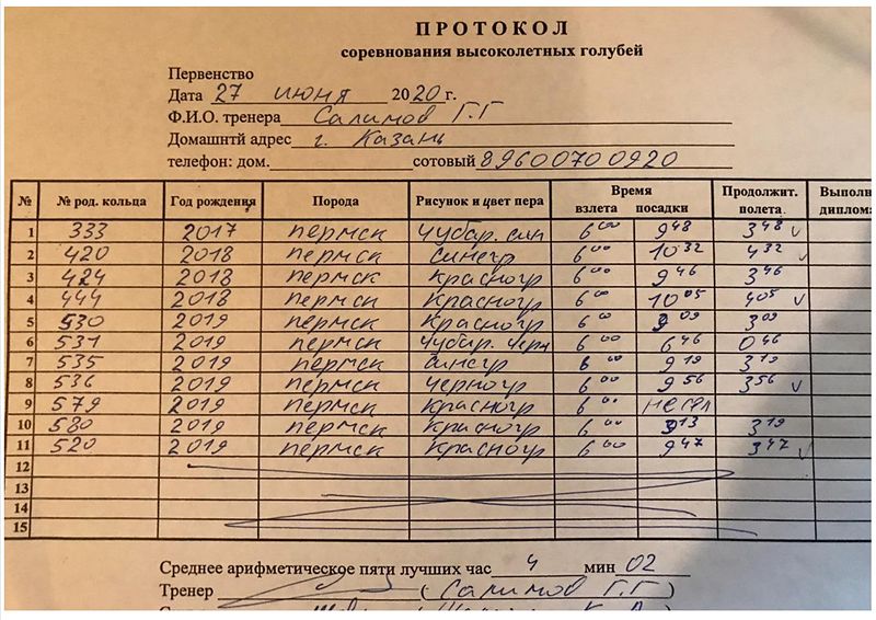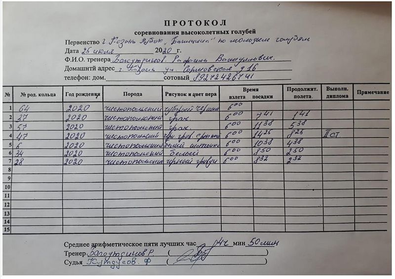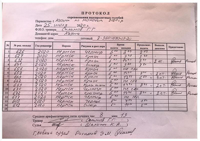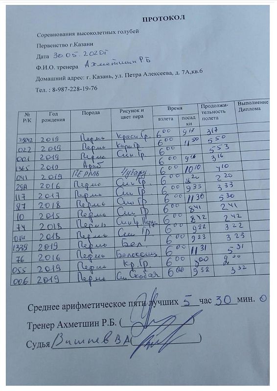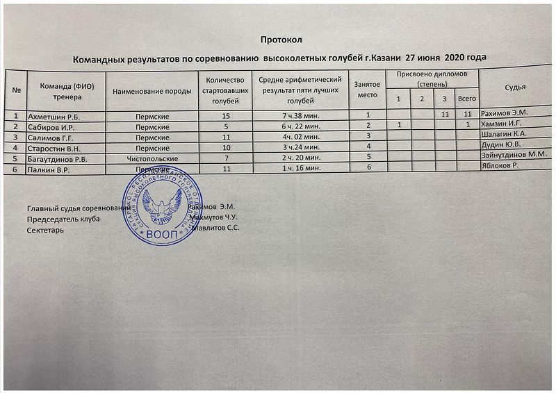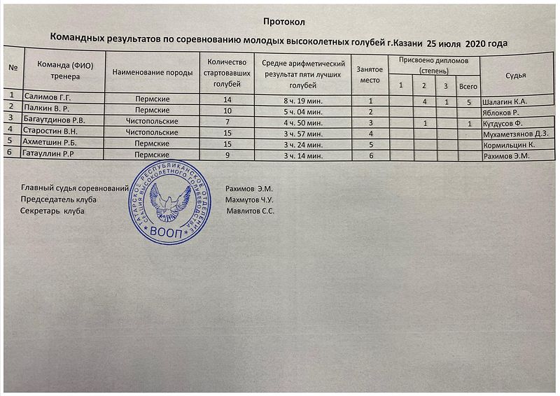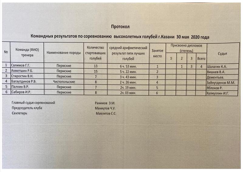 Протоколы результатов соревнований высоколетных голубей г.Казани