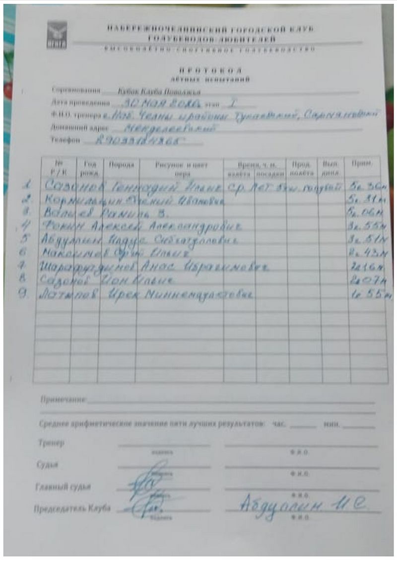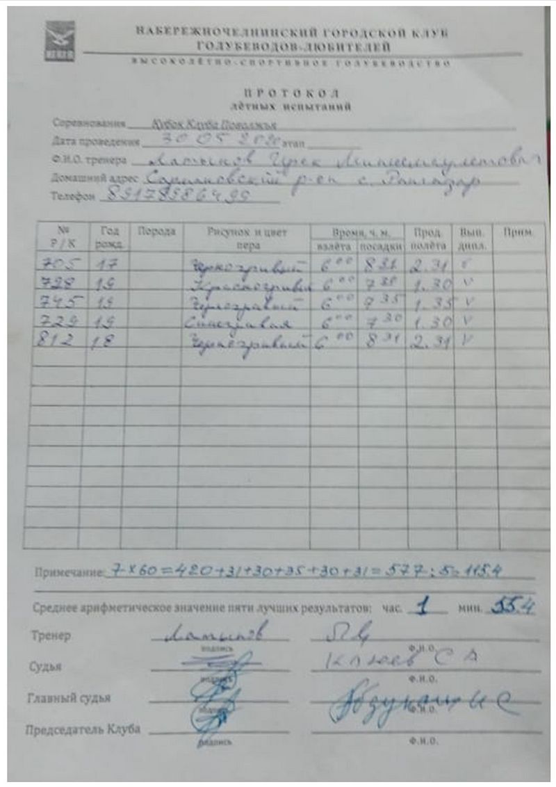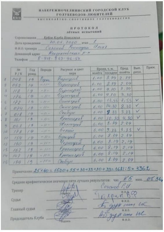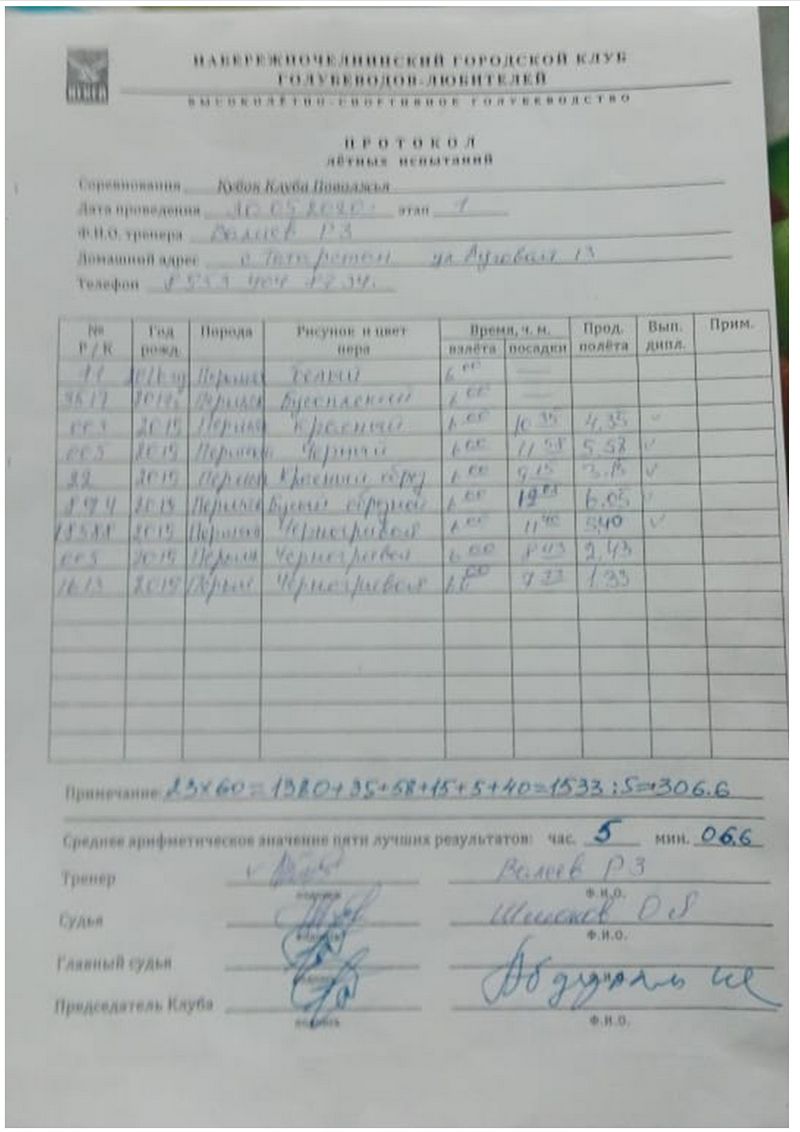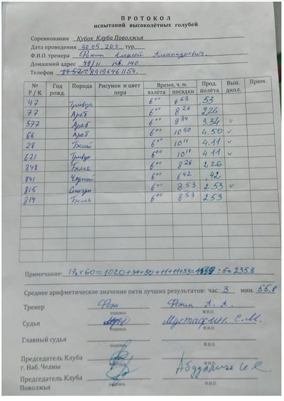 Протоколы соревнований высоколетных голубей г.Набережные Челны