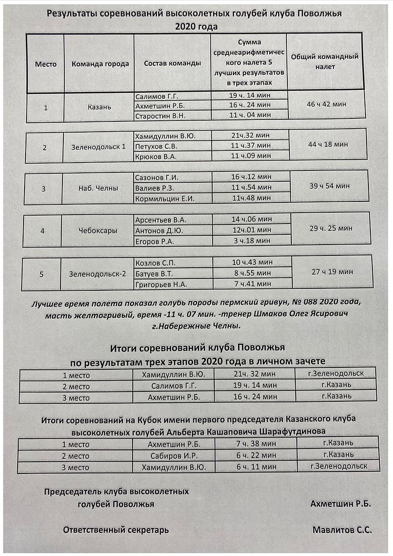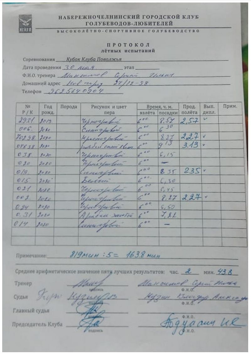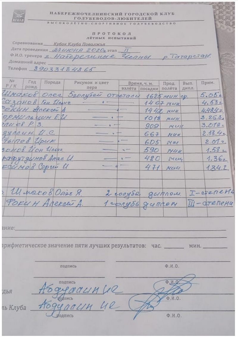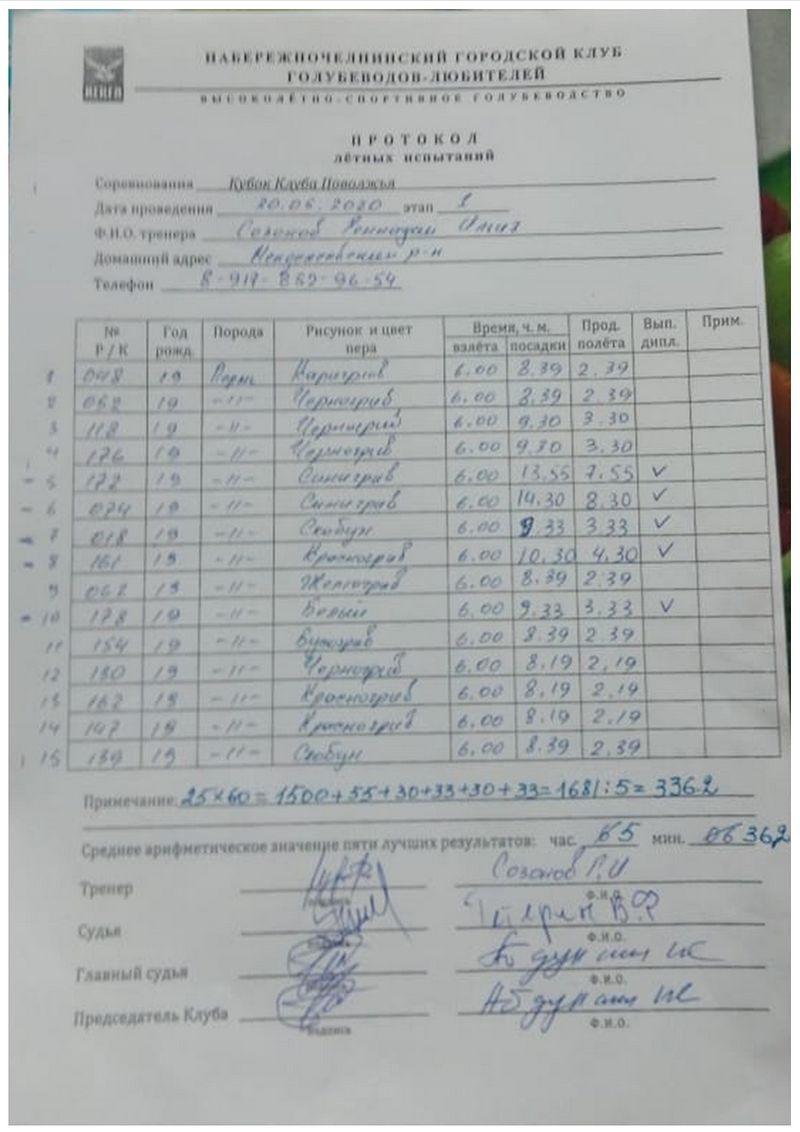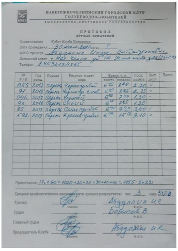 Протоколы соревнований высоколетных голубей г.Набережные Челны