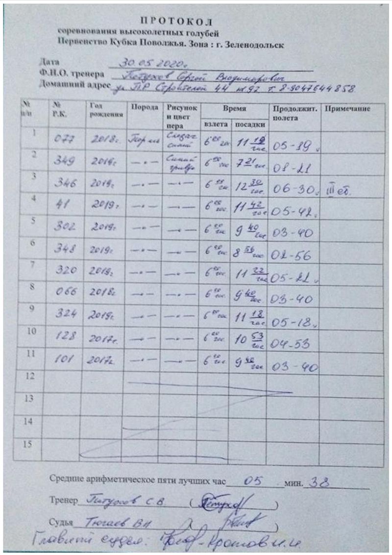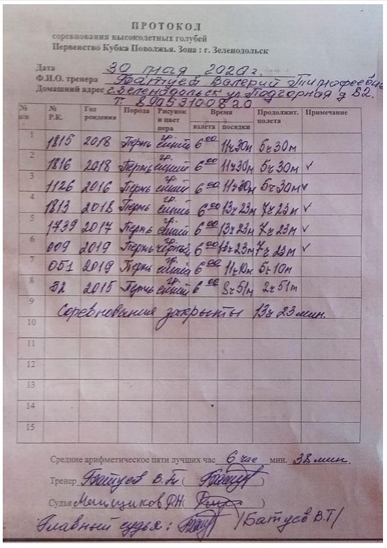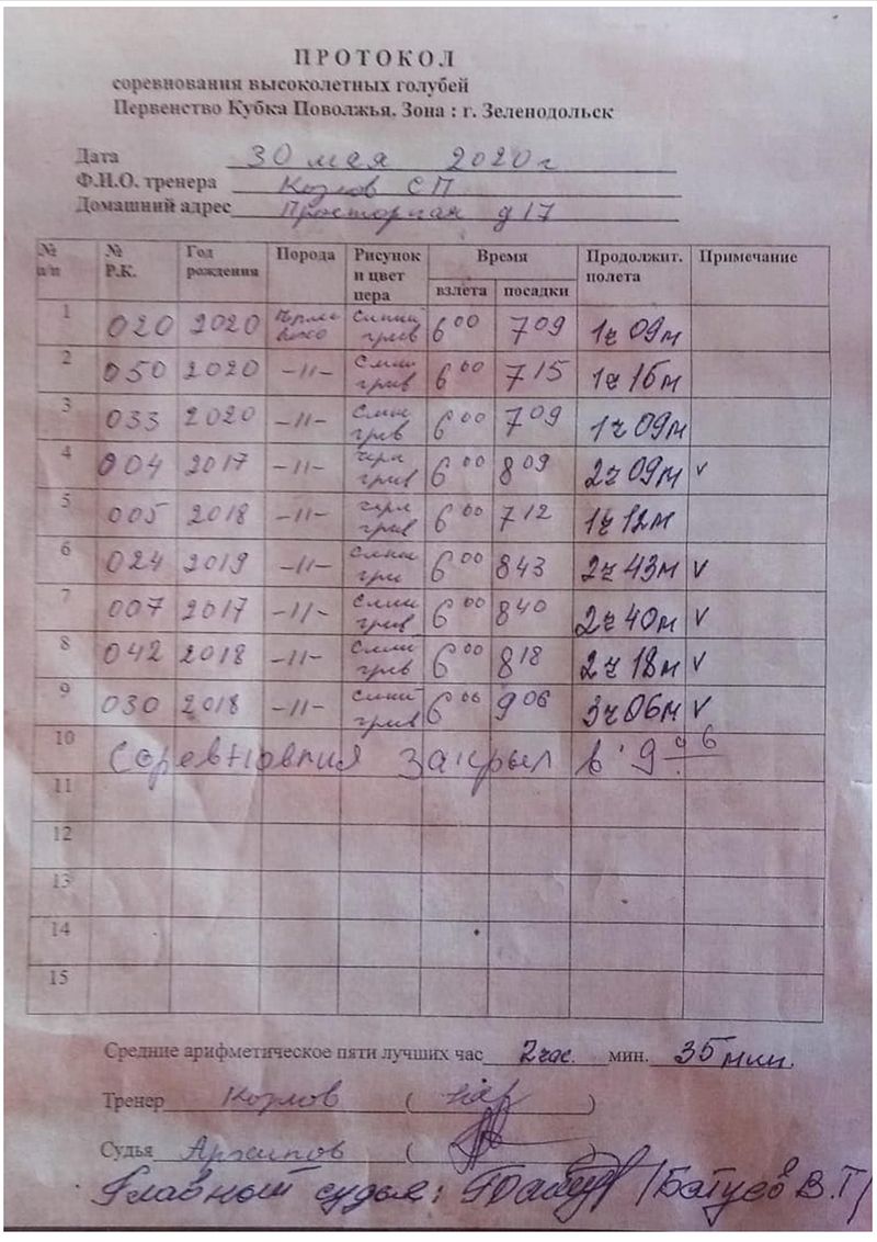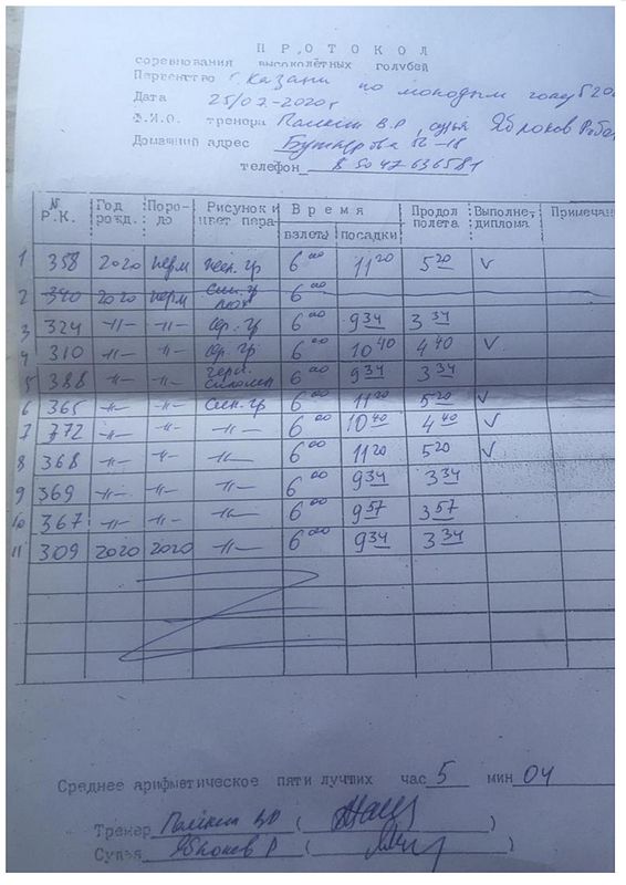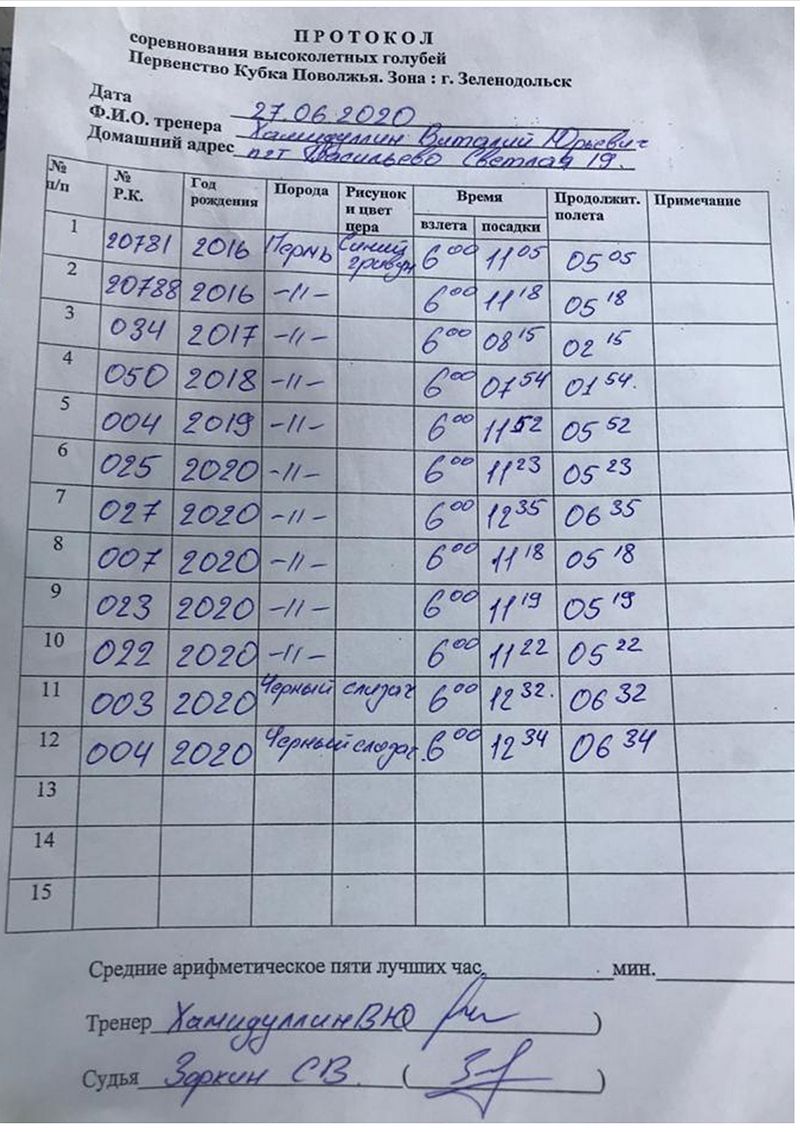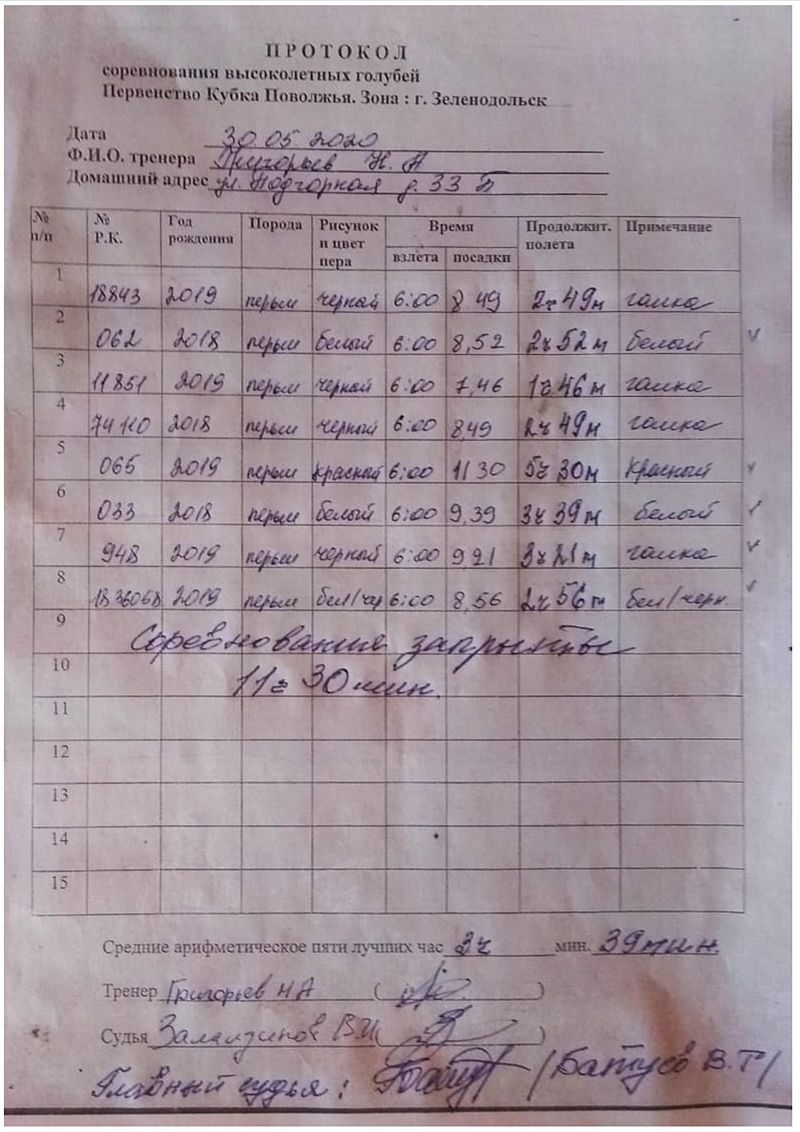 Протоколы соревнований высоколетных голубей г.Зеленодольск