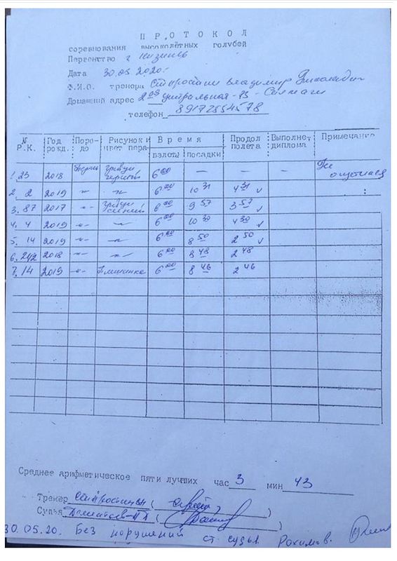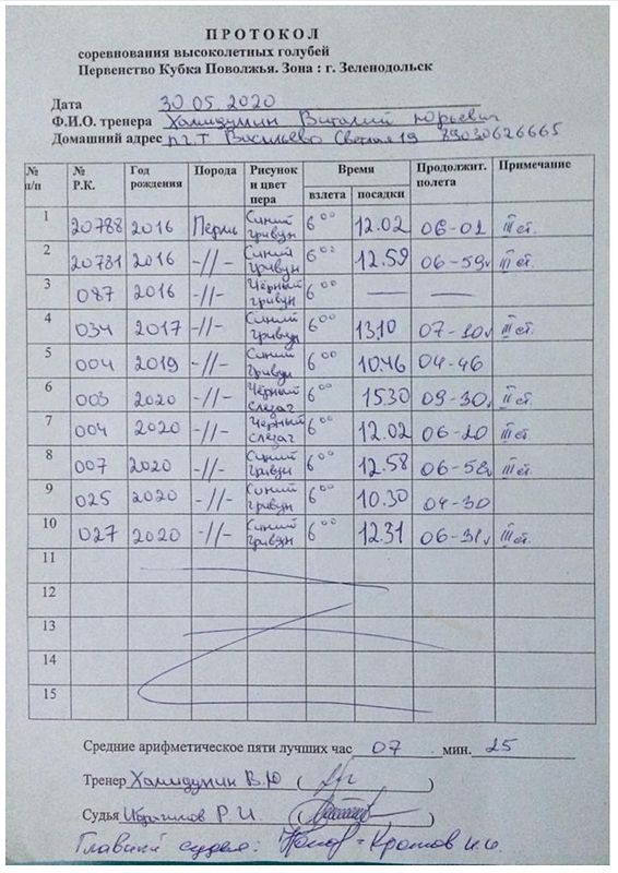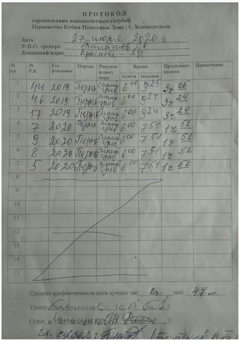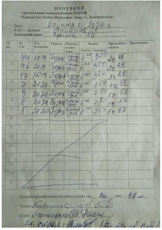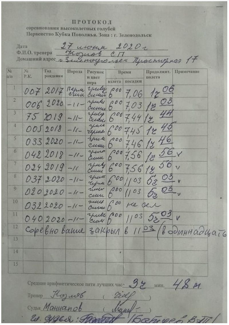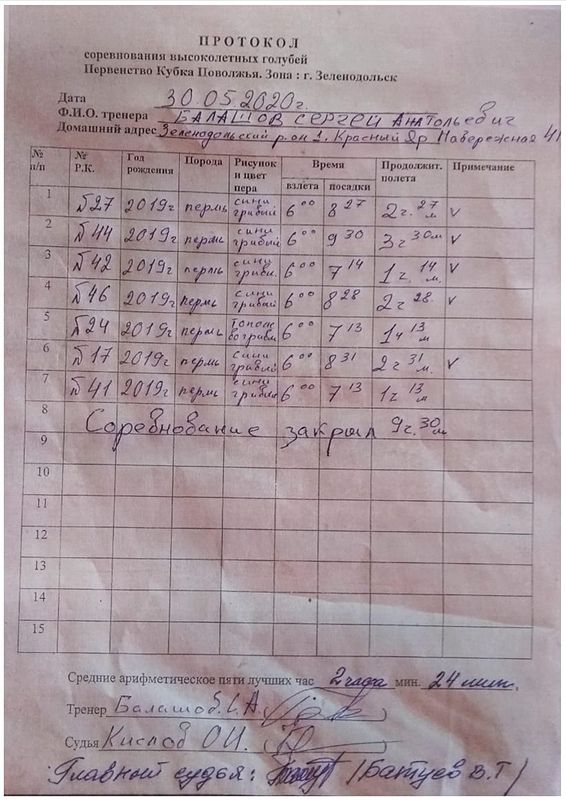 Протоколы соревнований высоколетных голубей г.Зеленодольск