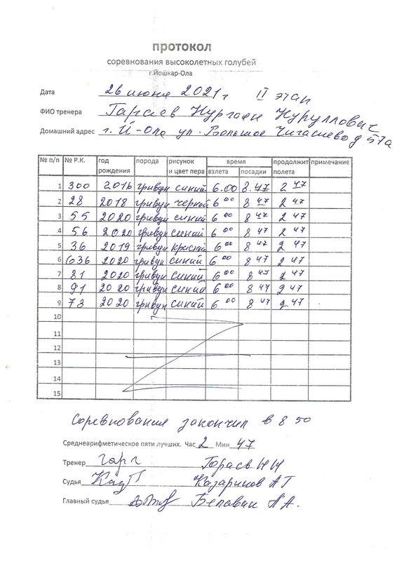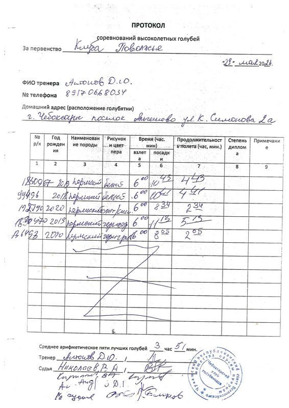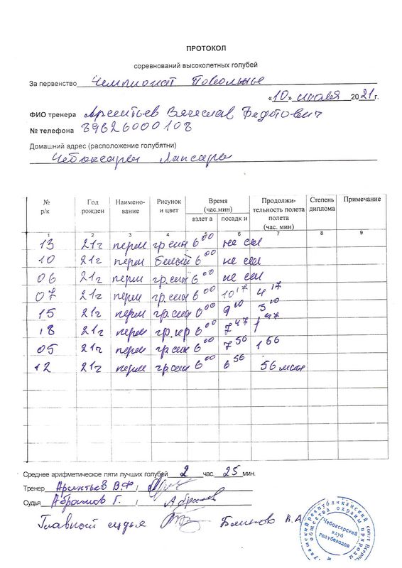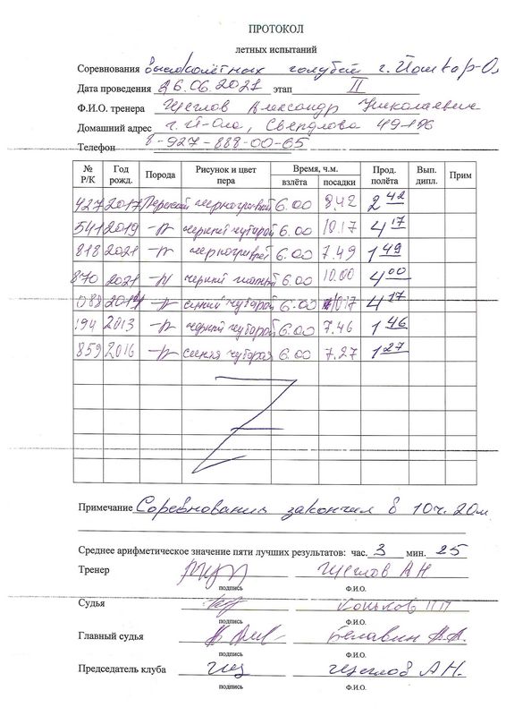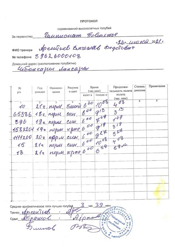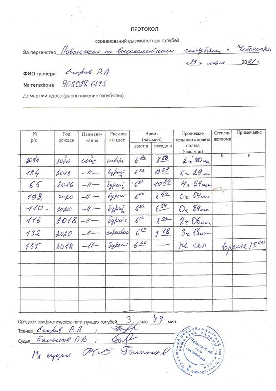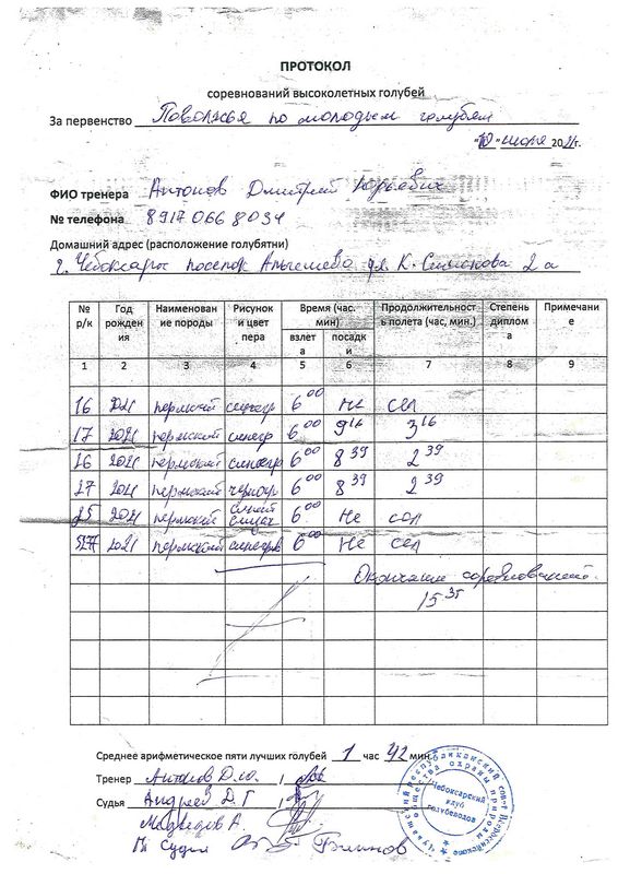 Протоколы соревнований высоколетных голубей г. Чебоксары