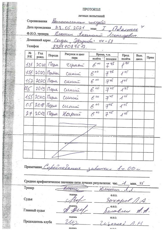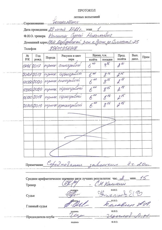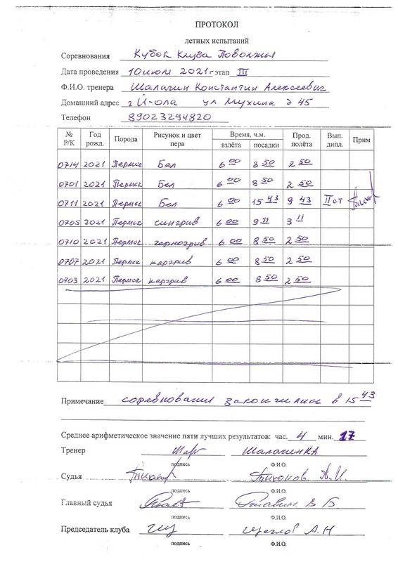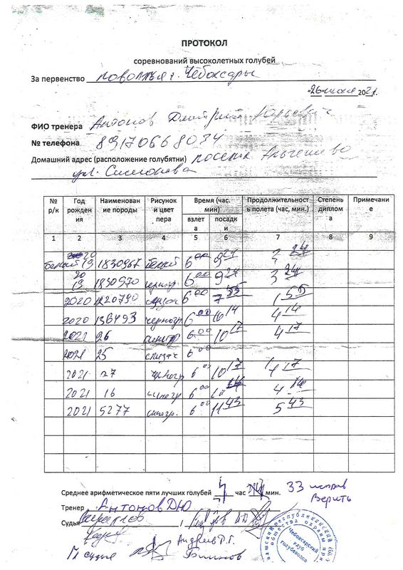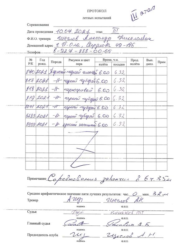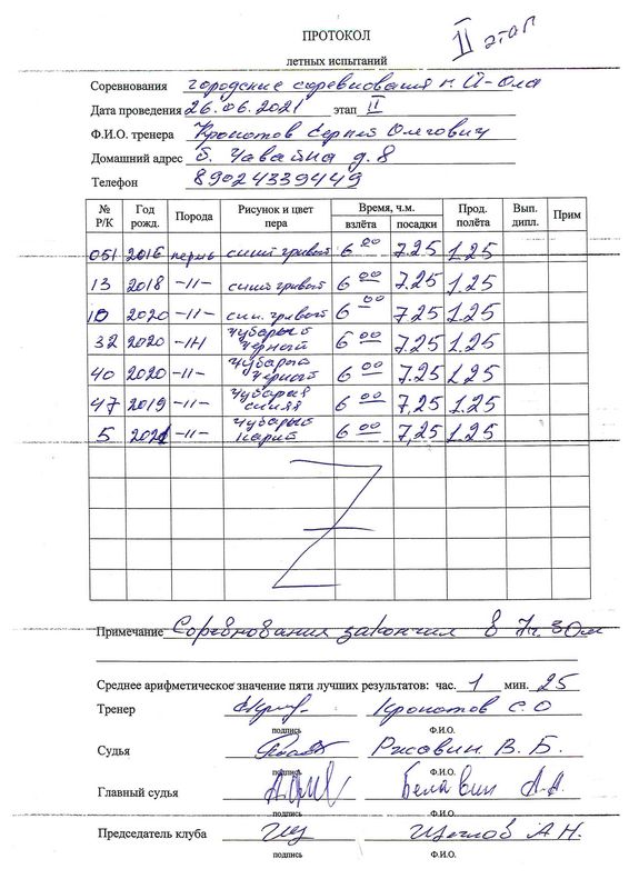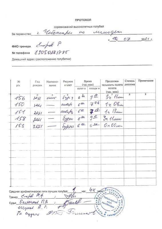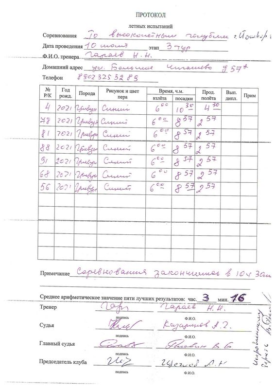 Протоколы соревнований высоколетных голубей г. Чебоксары