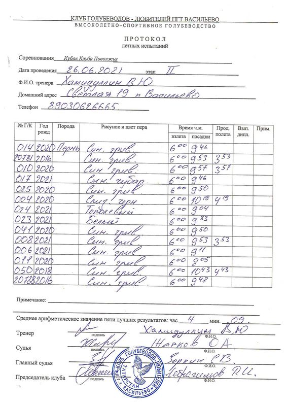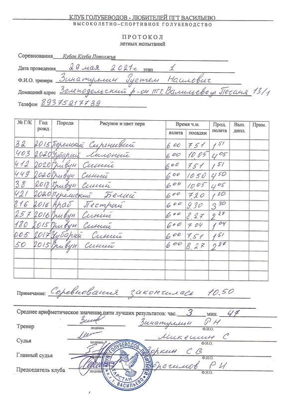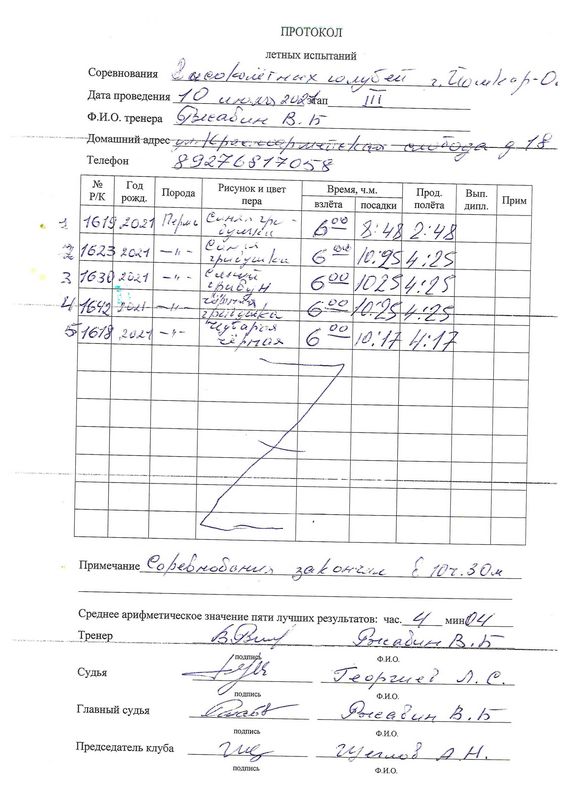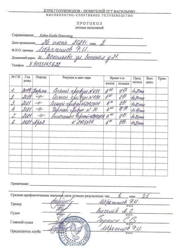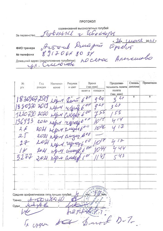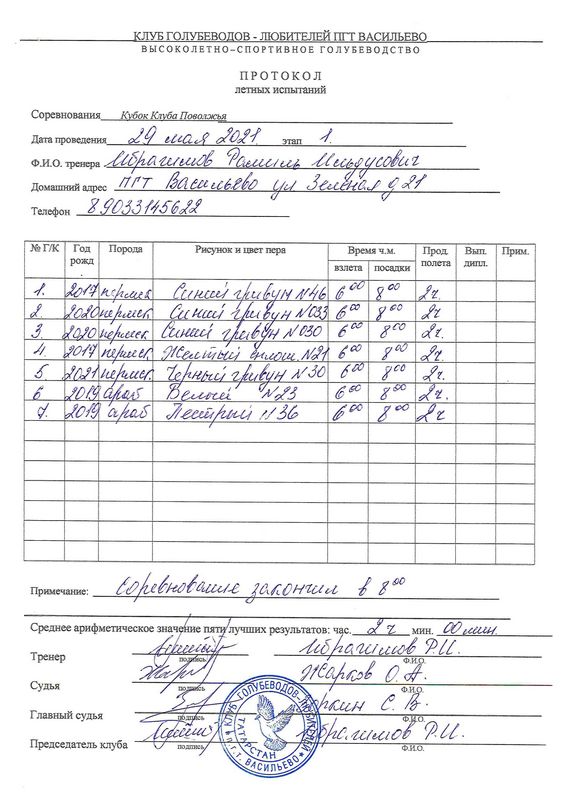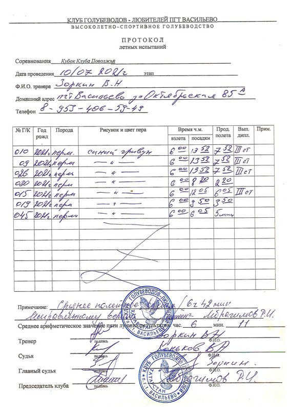 Протоколы соревнований высоколетных голубей п.г.т. Васильево