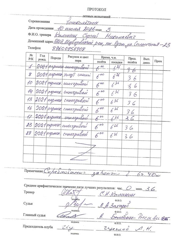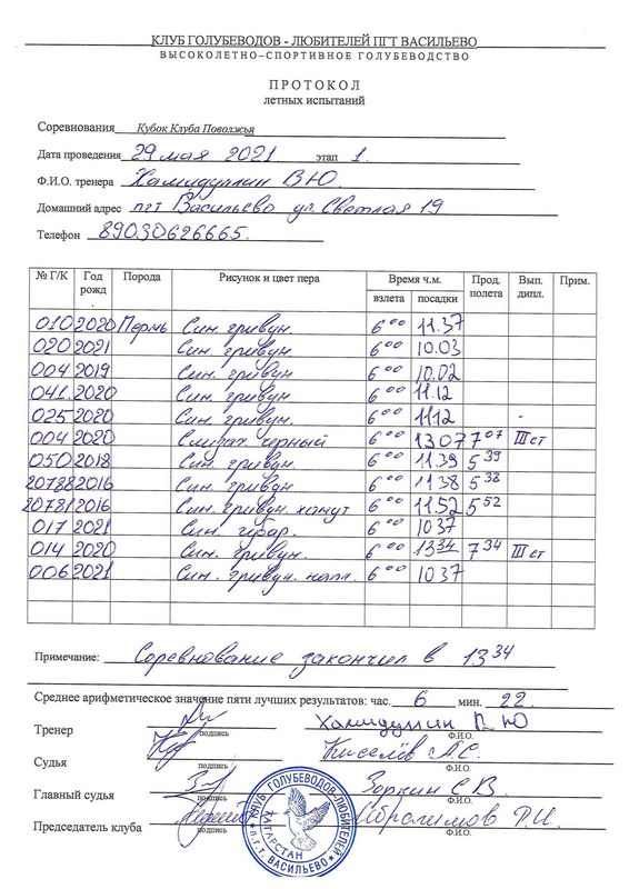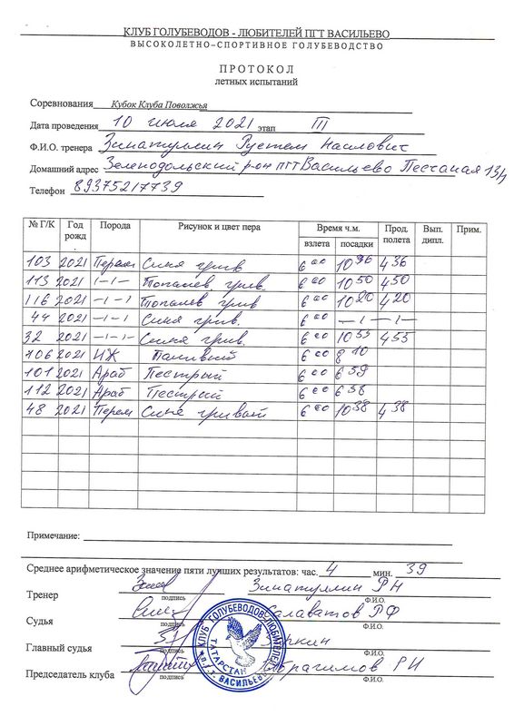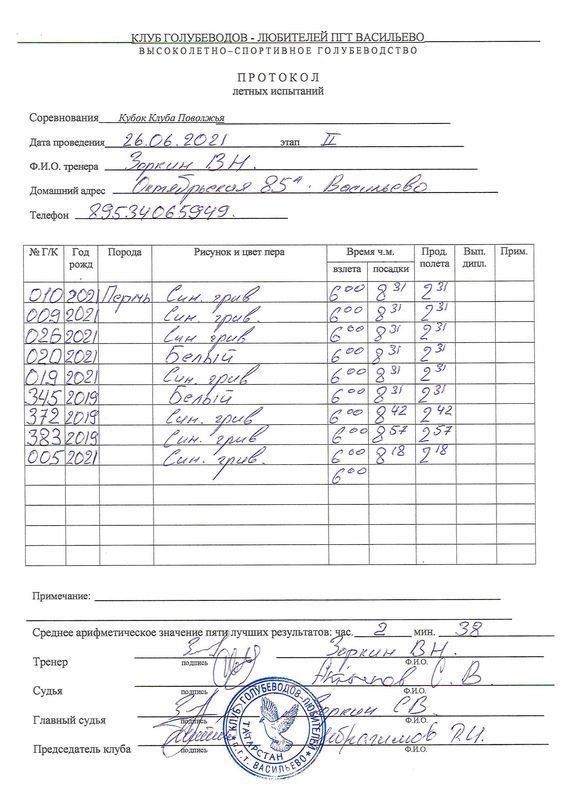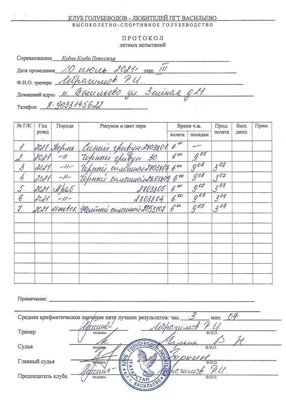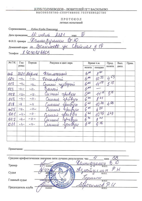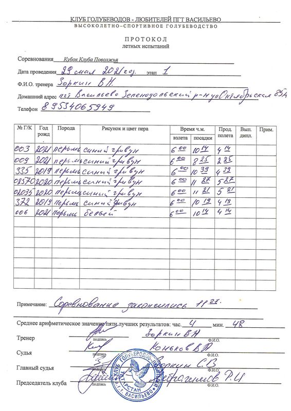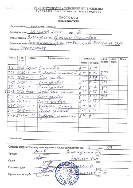 Протоколы соревнований высоколетных голубей п.г.т. Васильево