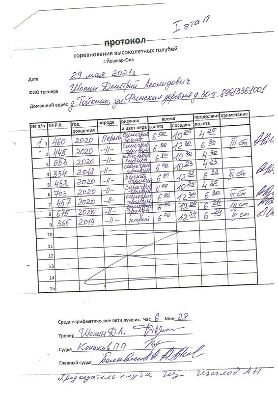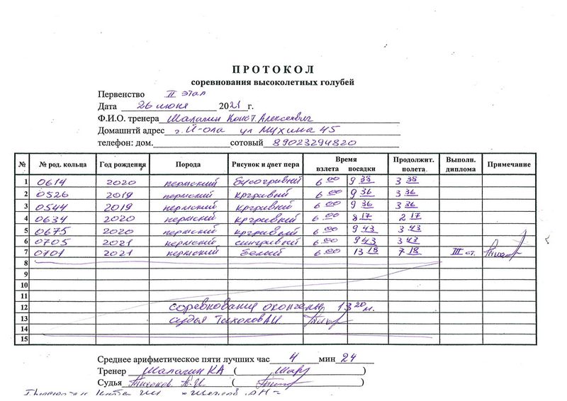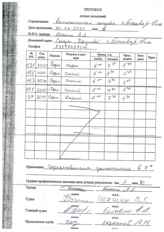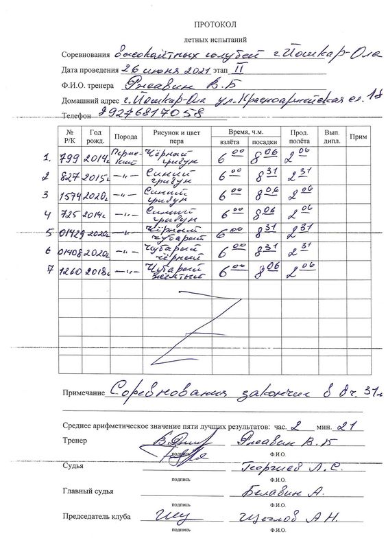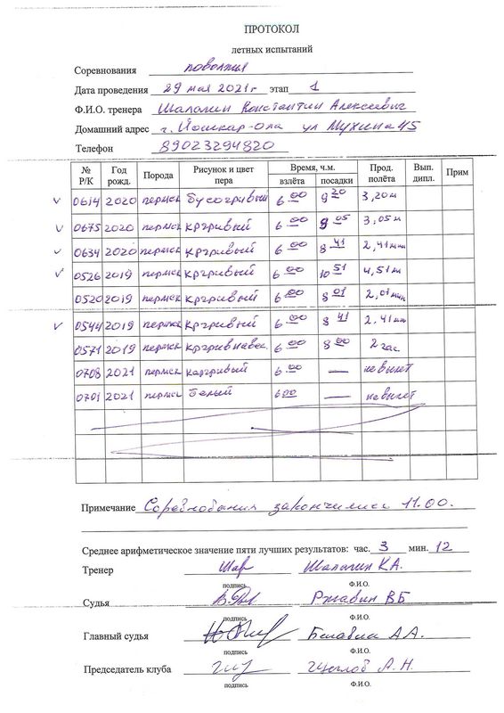 Протоколы соревнований высоколетных голубей г.Йошкар-Ола