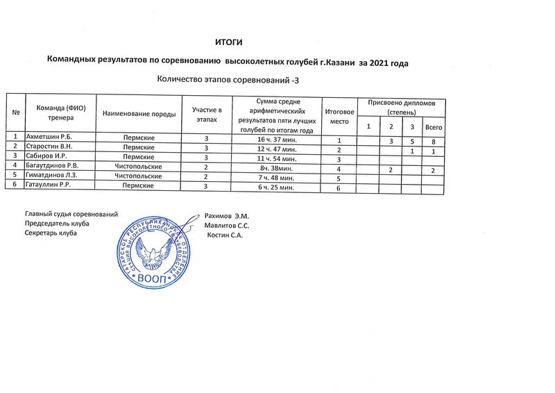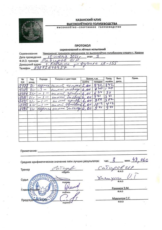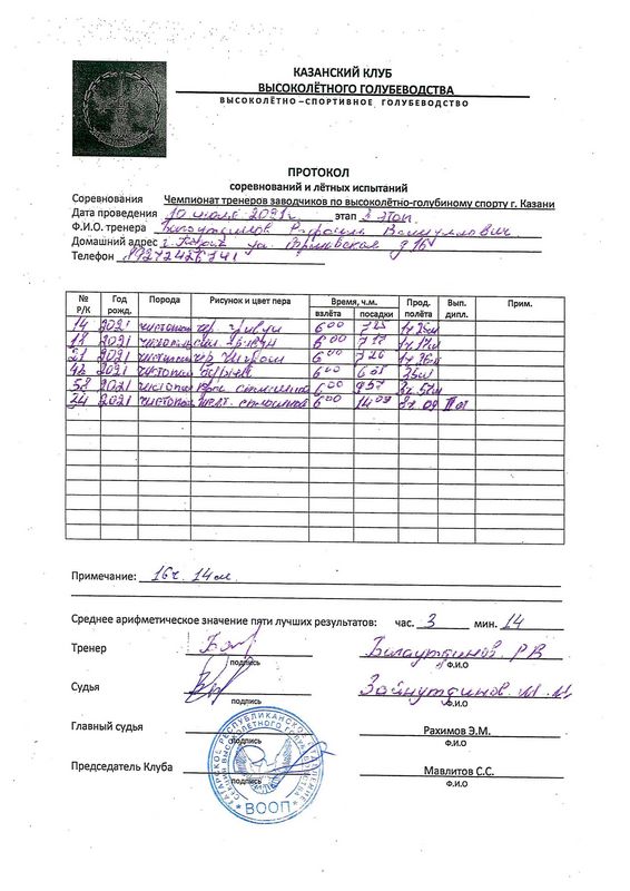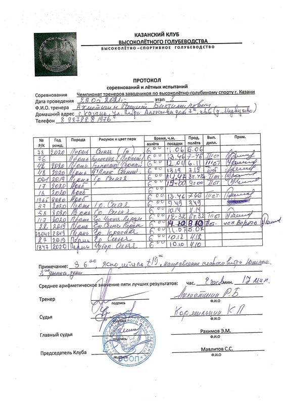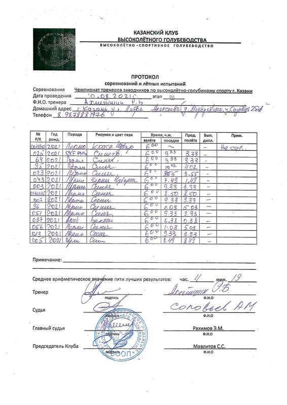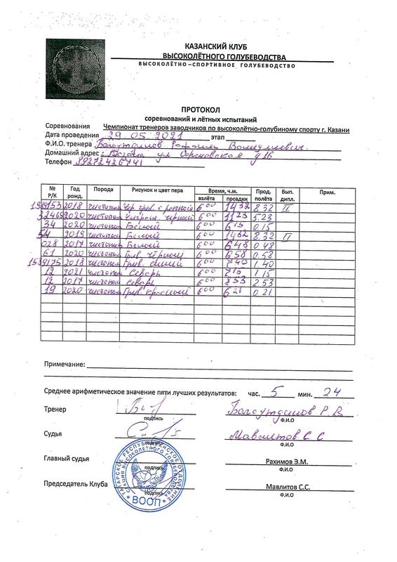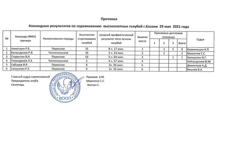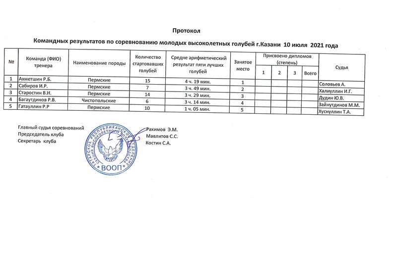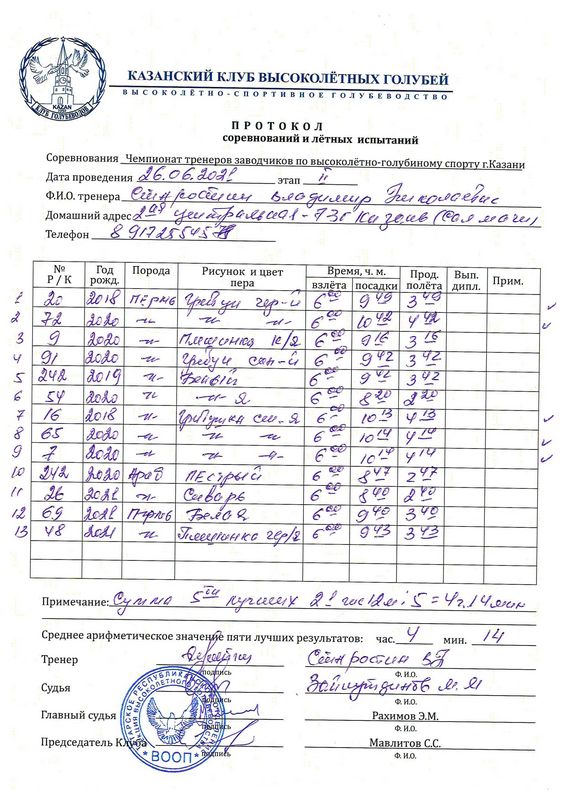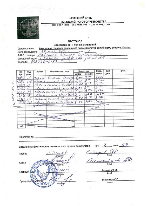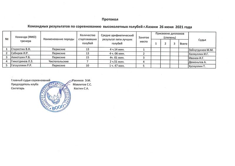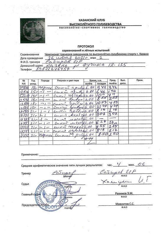 Протоколы результатов соревнований высоколетных голубей г.Казани